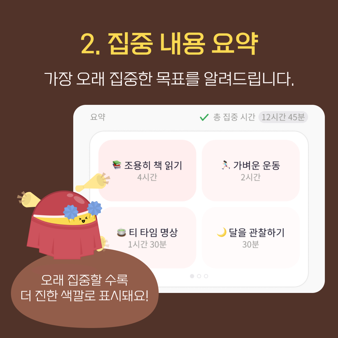 가장 오래 집중한 목표부터 가장 짧게 집중한 목표까지 한 눈에 볼 수 있는 화면입니다. 일간, 주간, 월간 기준으로도 볼 수 있죠.