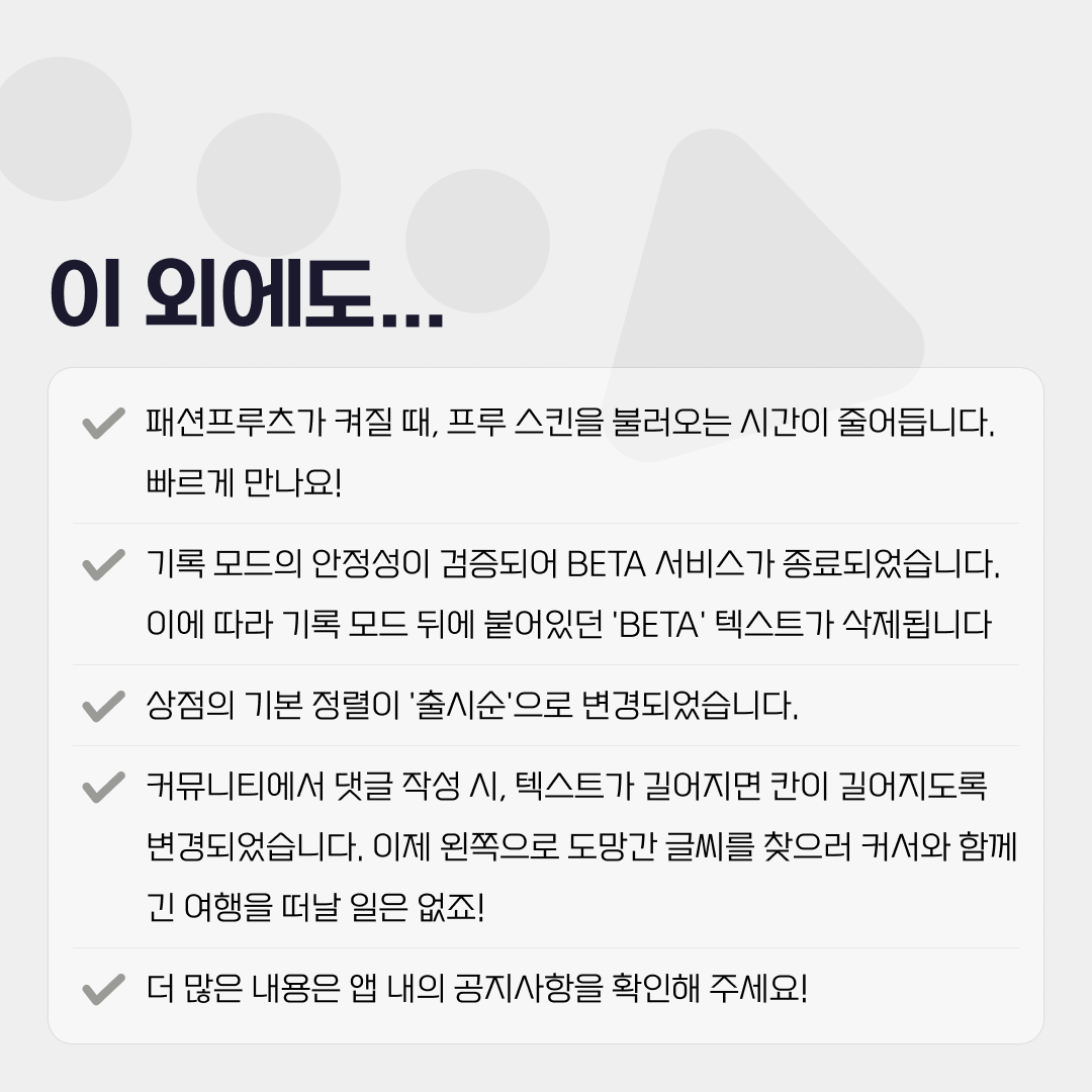 - 기록 모드의 안정성이 검증되어 BETA 서비스가 종료되었습니다. 이제부터 기록 모드는 정식으로 서비스되며, 이에 따라 기록 모드 뒤에 붙어있던 'BETA' 텍스트가 삭제됩니다.