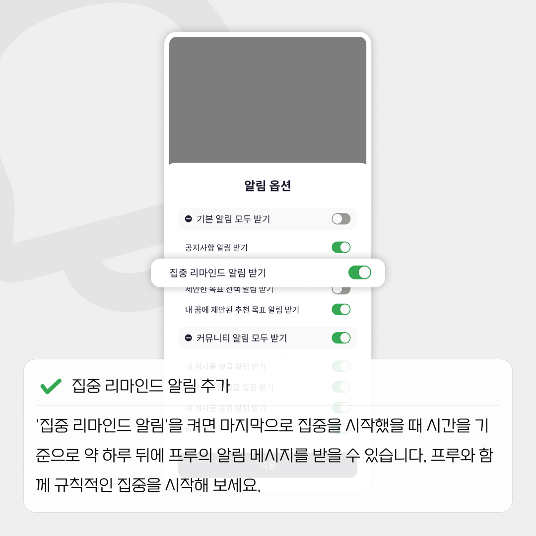그런 때에 바로 '집중 리마인드 알림' 기능이 필요하죠. 강력한 동기부여가 필요한 분이라면 꼭 사용해 보세요. '집중 리마인드 알림'을 켜면 마지막으로 집중을 시작했을 때 시간을 기준으로 약 하루 뒤에 프루의 알림 메시지를 받을 수 있습니다. 프루와 함께 규칙적인 집중을 시작해 보세요.