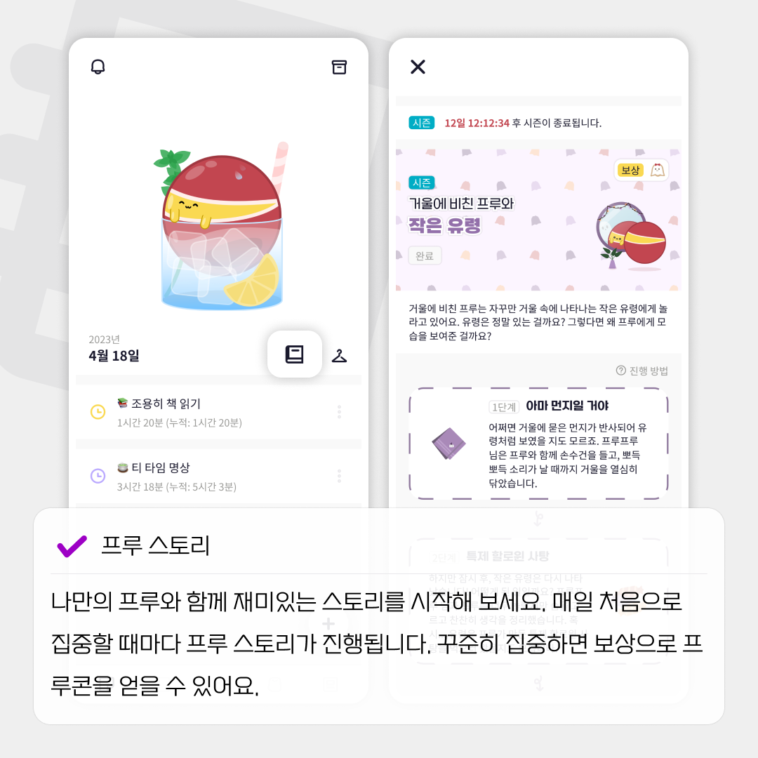 프루 스토리는 새롭게 생긴 '스토리 점수'로 진행할 수 있는 콘텐츠입니다. 스토리 점수는 하루 중 처음으로 집중을 완료하면 받을 수 있죠. 하나의 프루 스토리는 총 5단계로 구성되어 있으며, 각 단계별로 필요한 스토리 점수가 정해져 있습니다. 모든 단계를 여시는 분들을 위해 특별한 보상도 기다리고 있습니다! 꾸준히 집중하시는 분들이라면, 프루 스토리에 도전해 보세요.